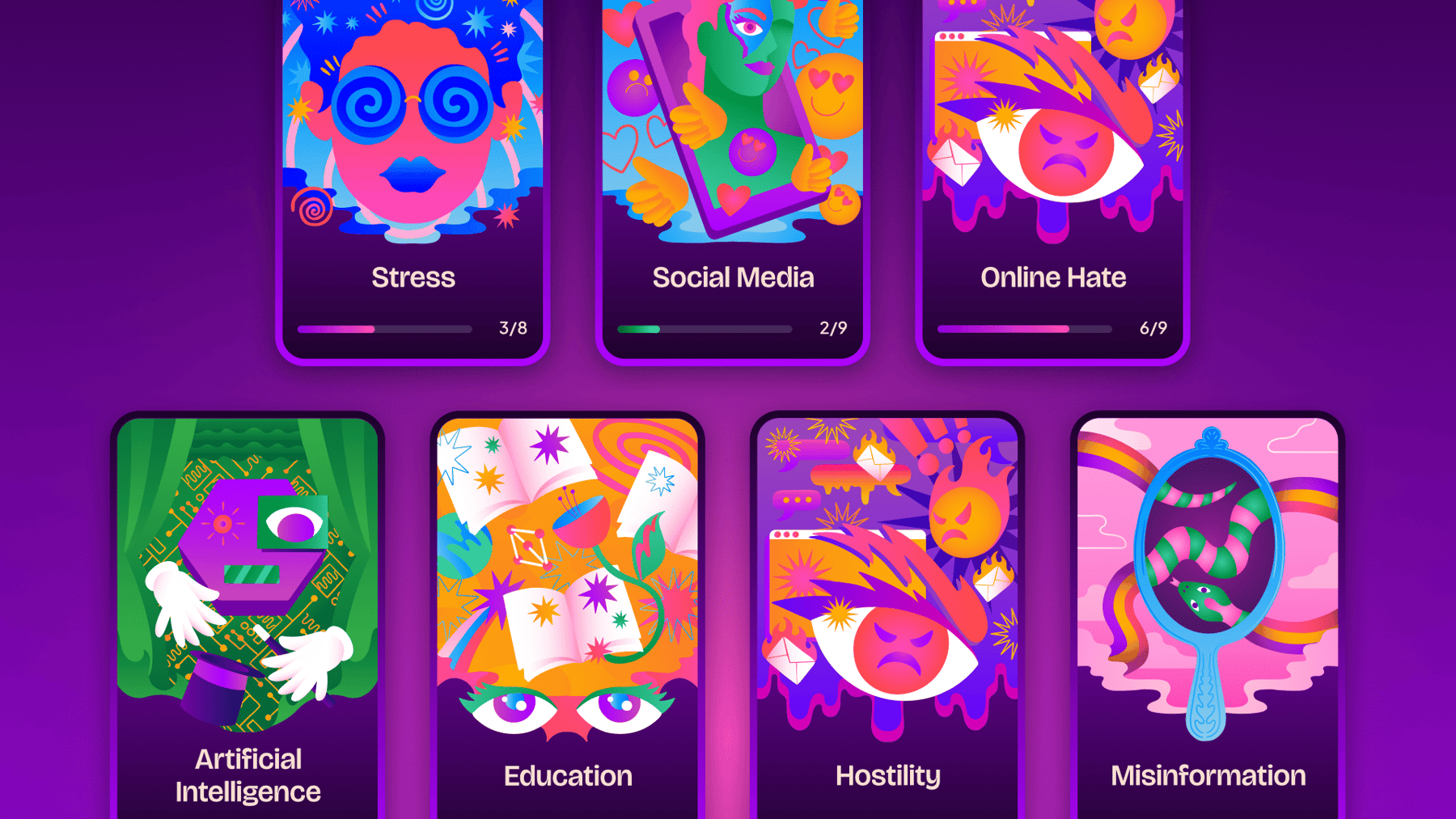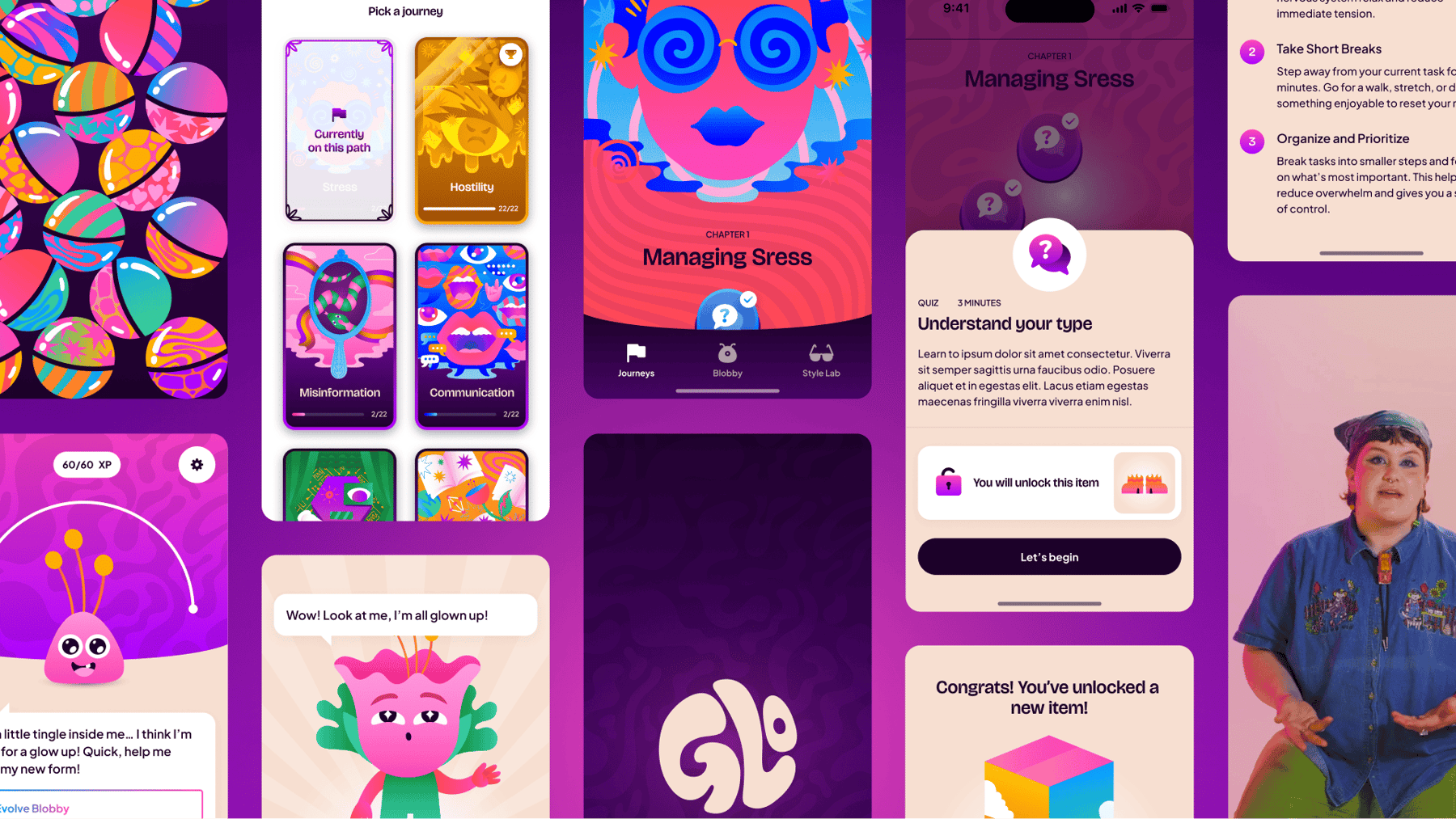 Glo, une créature introduite lors de la première session, agit comme un ancrage émotionnel. Elle évolue à mesure que les utilisateur·trices accomplissent des parcours éducatifs (gestion du stress, communication, culture numérique), créant ainsi une puissante boucle de rétroaction qui maintient l’engagement.