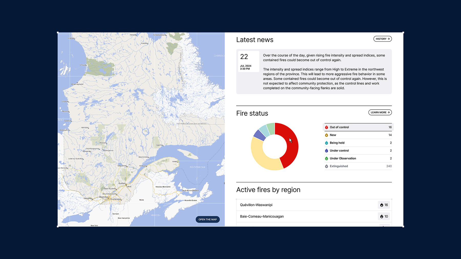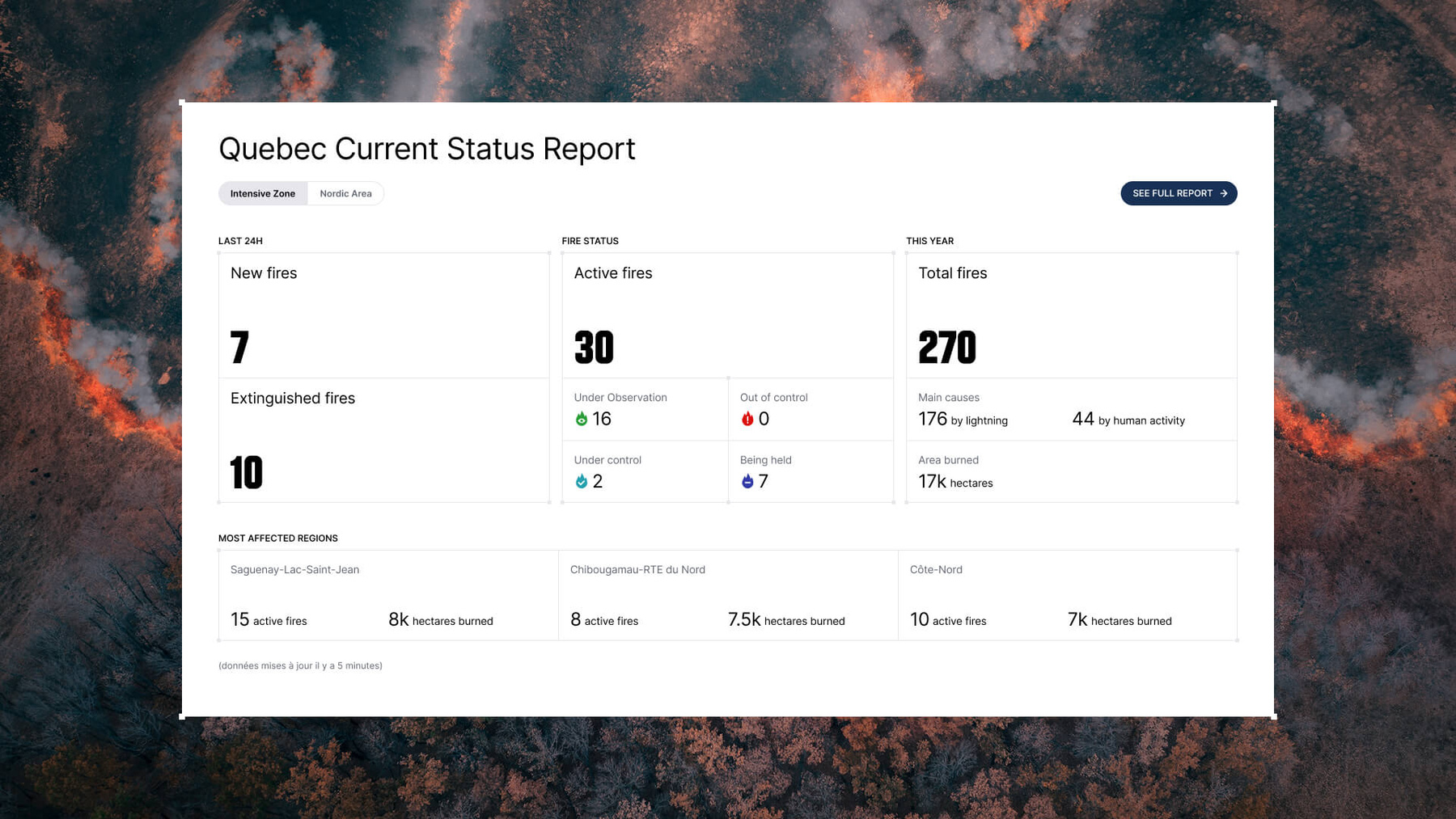 La carte fait le pont entre deux mondes : la profondeur des données pour les utilisateur·trices averti·es et la clarté immédiate pour le public. En permettant un filtrage précis par région ou par incendie, l’interface fluidifie la navigation tout en éduquant l’utilisateur·trice en douceur. Chaque interaction fait plus que trier des données : elle sensibilise. Elle transforme une télémétrie technique en un véritable outil de prévention pour la collectivité.